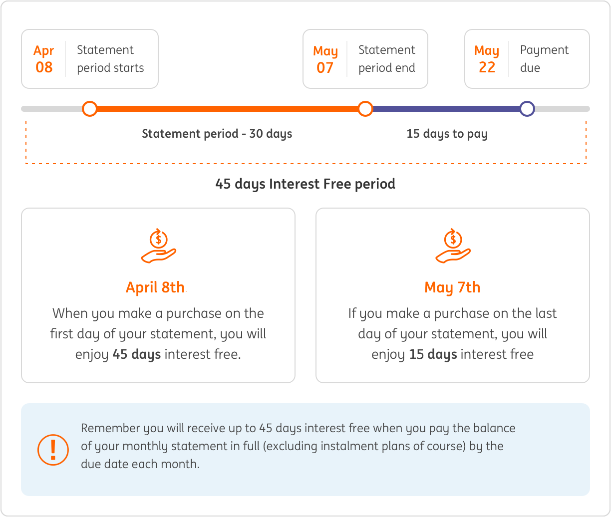 Interest-free days on credit cards are a set number of days in which you won't be charged any interest on purchases, provided that you pay off your monthly balance in full. Most credit cards come with an interest free period on standard purchases. ING has up to 45 days interest-free on the Orange One credit cards. Note that to get the benefit of an interest free period, you need to have paid your previous month's closing balance in full and have no outstanding debt (excluding an instalment plan of course) on that card. Let's have a closer look at an example of how the interest free benefit may work.
