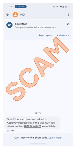 We're aware of fake SMS' currently circulating which claim to be from ING. The SMS' are advising that ApplePay was successfully added and if not authorised to call the number provided immediately.