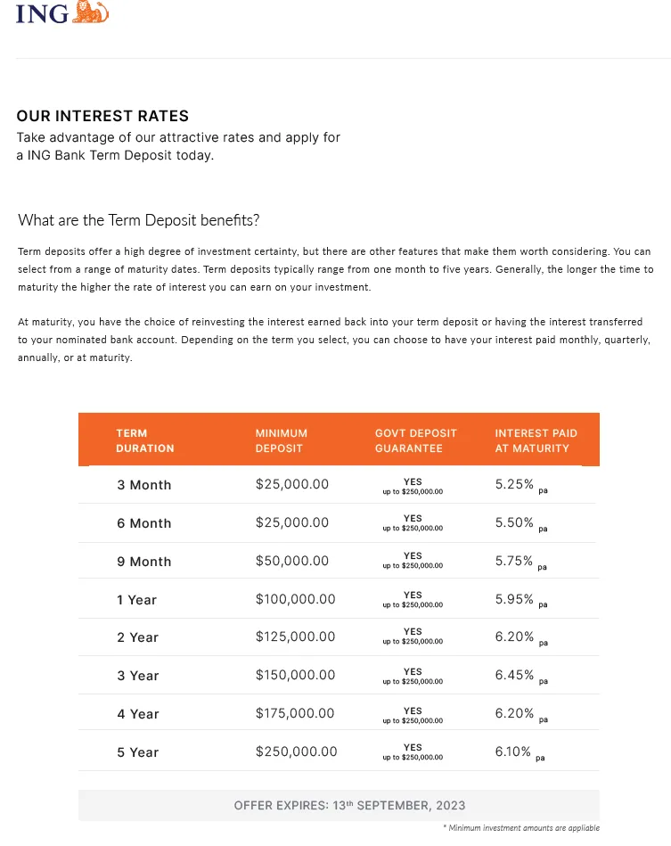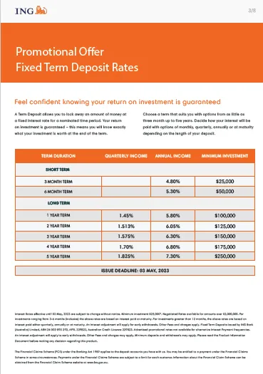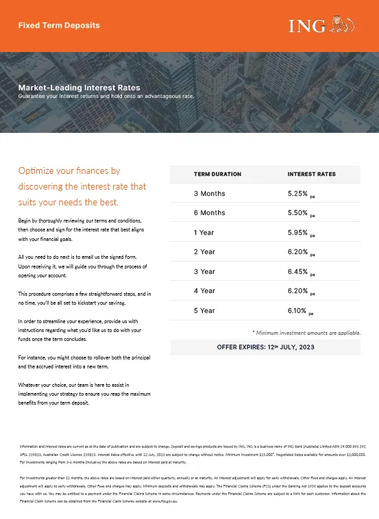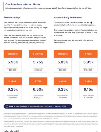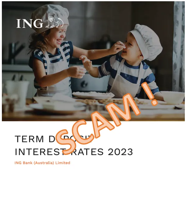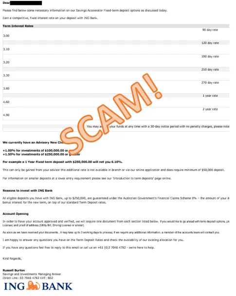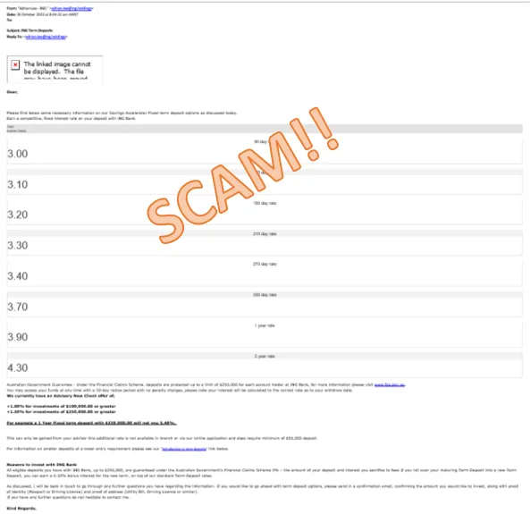 Scammers are sending emails pretending to be ING and promoting false investment options for Fixed Term Deposits of 3 months to 5 years. These offerings have been included in fake ING branded emails. This is an investment scam so please do not click on any links or engage with these communications. We're taking steps to put a stop to these emails. In the meantime, beware of this scam and tell your friends too.