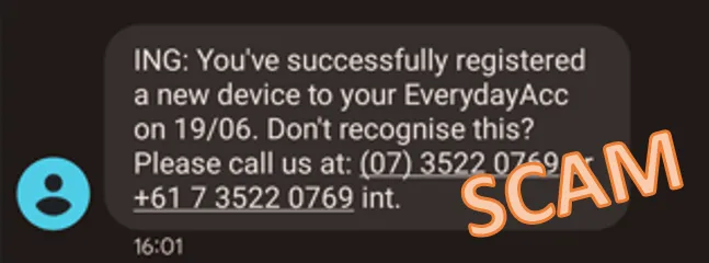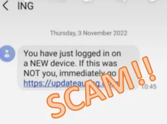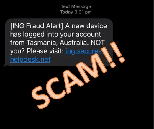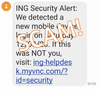 We're aware of a fake SMS currently circulating which claims to be from ING. The SMS is advising that you logged into a new device and to click a link if it was not you. Just so you know, we'd never ask you to provide personal details via a link in an unsolicited text or email. We're putting a stop to this SMS.