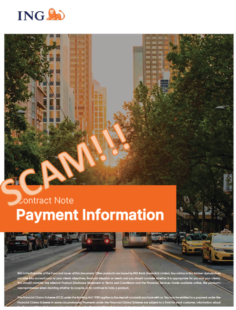 Scammers are pretending to be ING and promoting a fixed income investment structure proposal. This is an investment scam. So please keep your eyes open and tell your friends too.