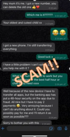 Be aware of a recent impersonation scam via social media platforms such as via WhatsApp where scammers are sending a text message from an unknown mobile phone number claiming to be a son, daughter, or family member. This is a scam. So please keep your eyes open and tell your friends too. You can block and report the number via the application and we recommend you do not engage.